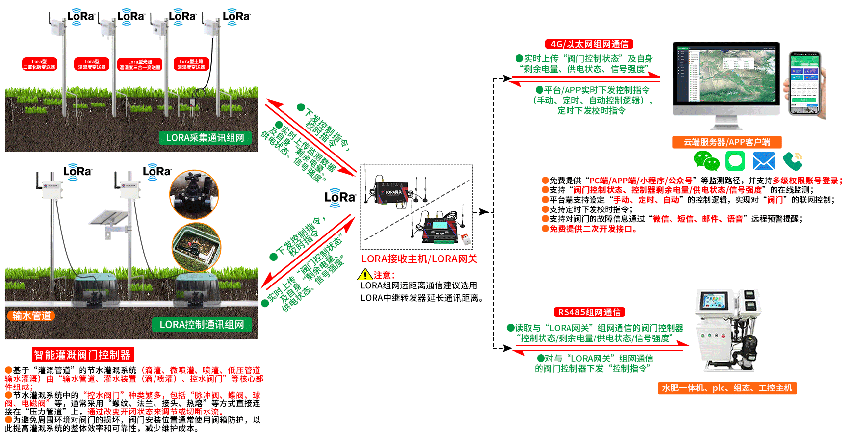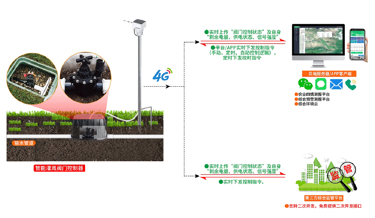 智能灌溉阀门控制器基于“4G、LORA、RS485”的物联网通信接口,依托我司提供的云服务、APP客户端,通过获取“平台控制指令”实现对联网阀门的精准控制和智能管理,使“管道节水灌溉系统”管理更加科学、合理、可靠,最终实现对不同地块“灌溉时长”的精准把控,确保灌溉用水的精确性与高效性。