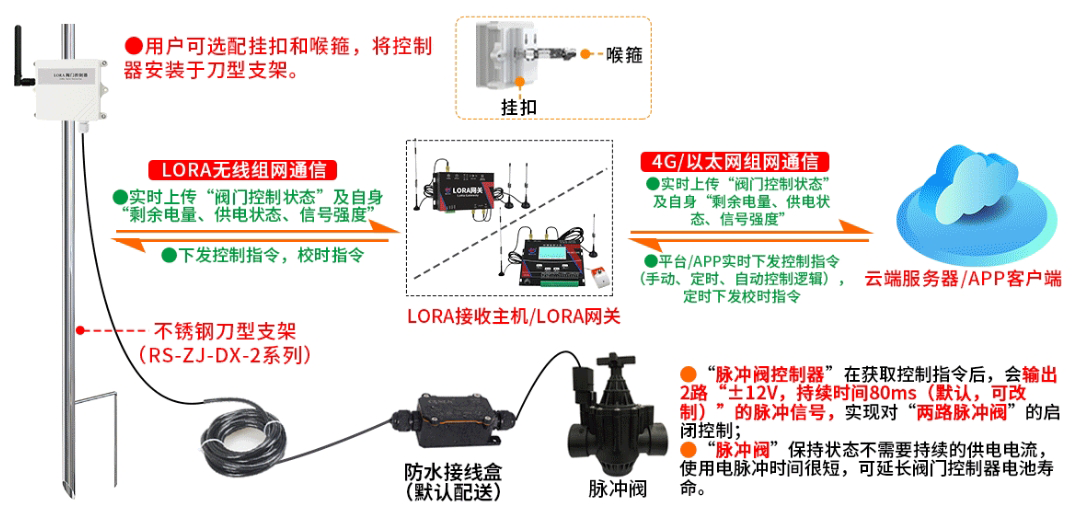同时,智能灌溉阀门控制器依托我司提供的云服务、APP客户端,基于“4G、LORA”的物联网通信接口,可通过获取“平台控制指令”实现对“两路脉冲阀”的联网控制,且设备还可将“阀门控制状态”及自身“剩余电量、供电状态、信号强度”等信息上传至软件平台,以此助力“管道节水灌溉系统”实现对“控水阀门”的精准控制和智能管理,大幅提升水资源利用效率。
