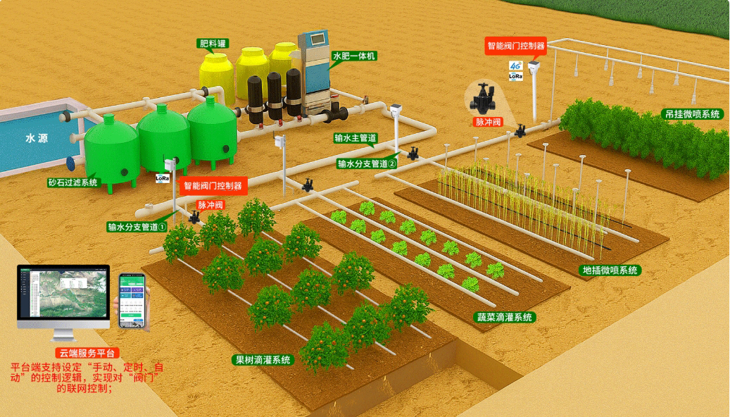 基于“灌溉管道”的节水灌溉系统(滴灌、微喷灌、喷灌、低压管道输水灌溉)由“输水管道、灌水装置(滴/喷灌)、控水阀门”等核心部件组成,是一种融“工程措施(管网)+灌水技术(滴/微喷)+智能控制”的三维一体的系统解决方案,是现代农业节水的核心手段。其中,节水灌溉系统中的“控水阀门”种类繁多,包括“脉冲阀、蝶阀、球阀、电磁阀”等,通常采用“螺纹、法兰、接头、热熔”等方式直接连接在“压力管道”上,通过改变开闭状态来调节或切断水流。
